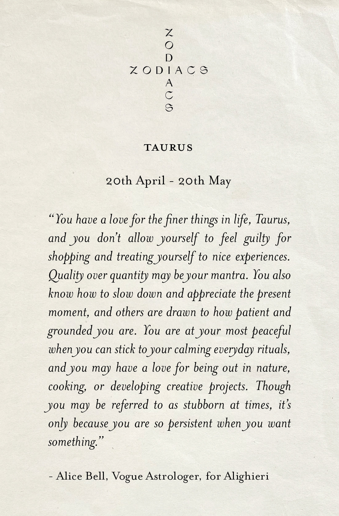 Enter the world of the Taurus brought to you with otherworldly artist, Mat Maitland and Vogue Astrologer Alice Bell. Carry the power of your sign to stay connected to your stars.