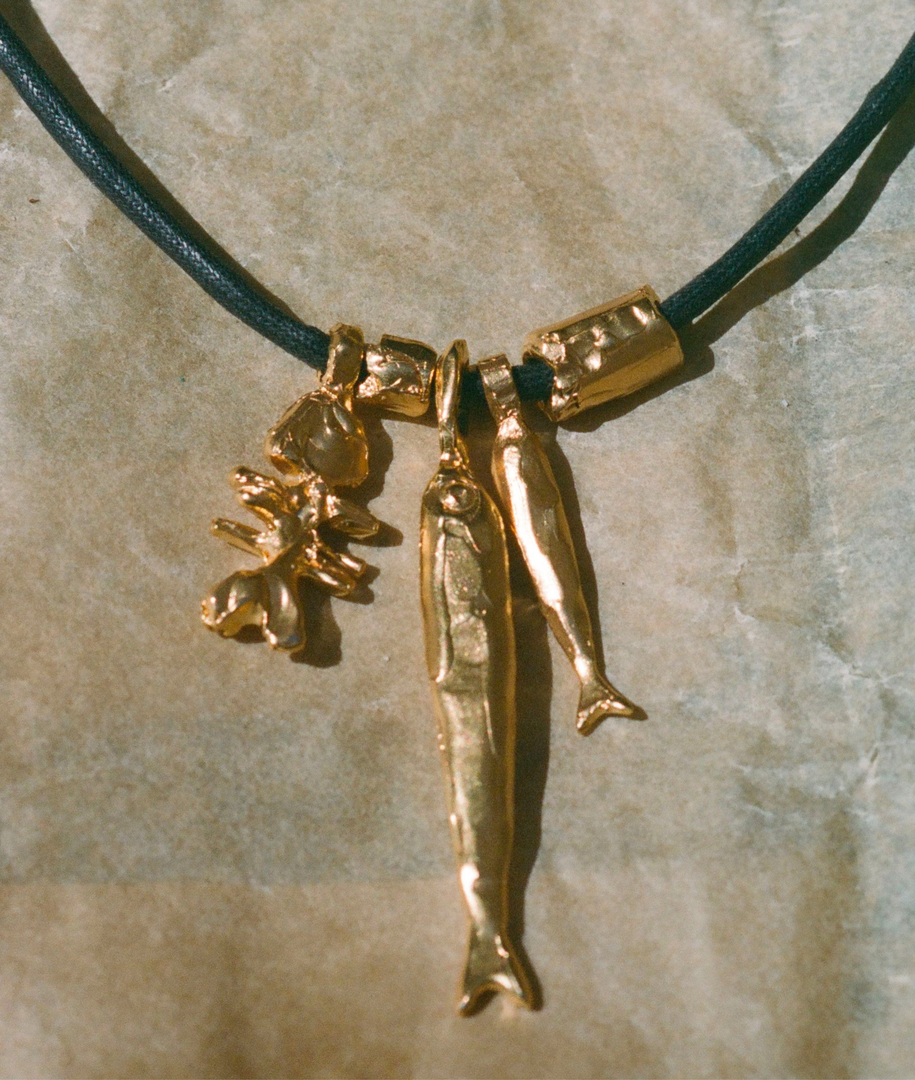 The Gone Fishing Choker celebrates the magic of seaside adventures and the summer souvenir. Three molten gold fish are suspended on black Japanese cord; cast in recycled bronze and plated in Alighieri’s signature 24kt gold-plating in the UK. Carry it to bring you all good things on your adventures.