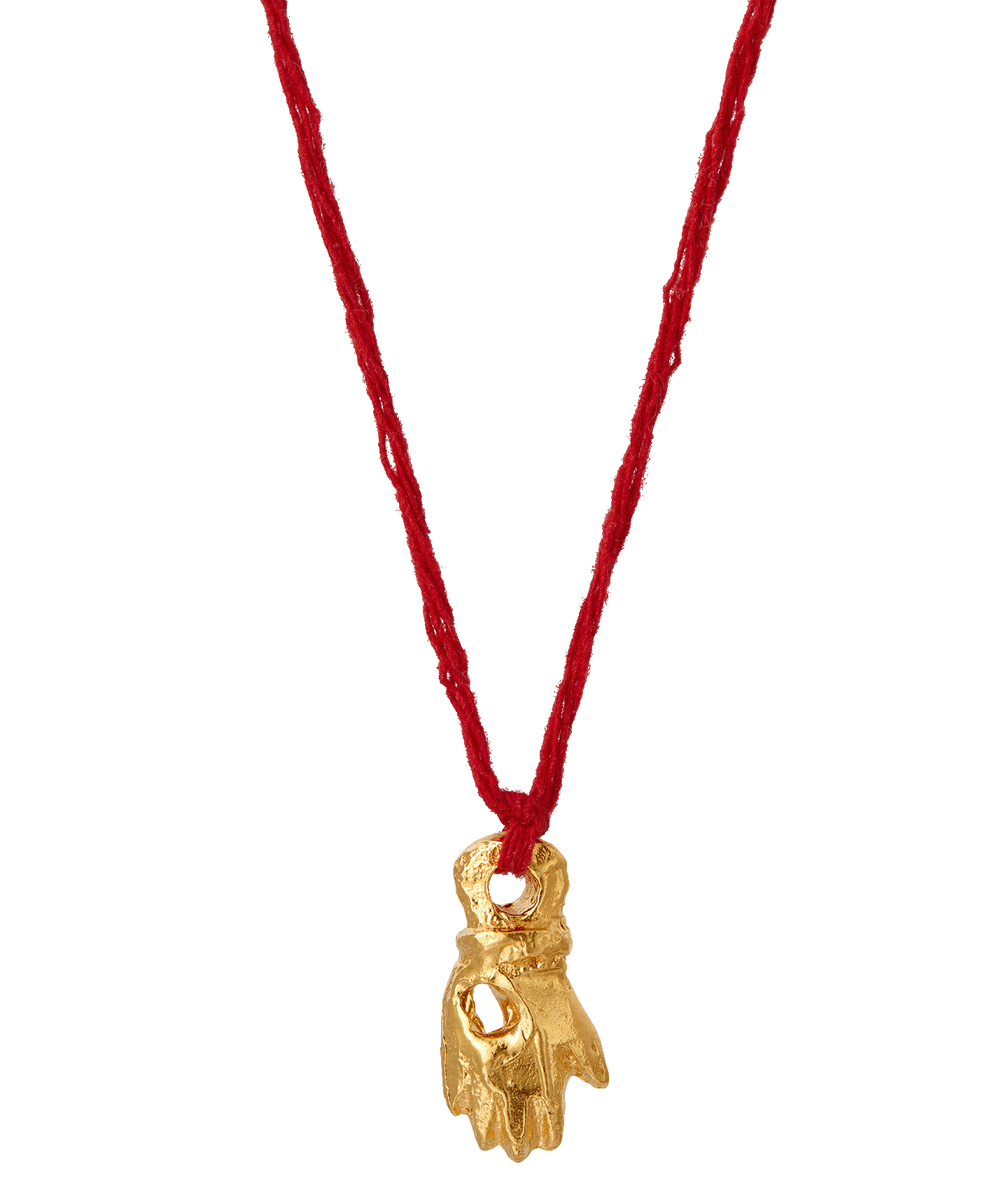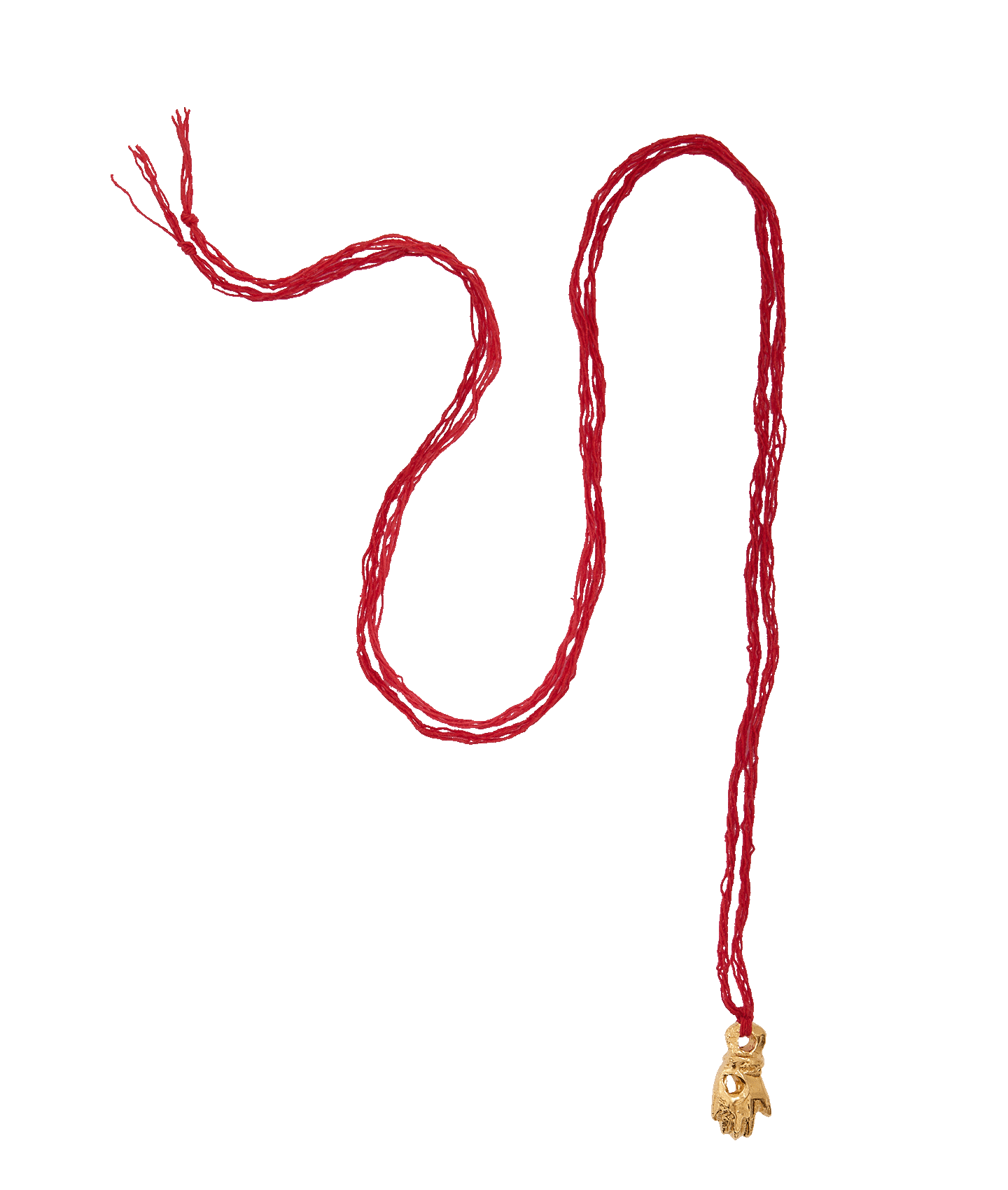 The Hand of Protection Necklace is a miniature talisman of protection, to guide you on all of your adventures. The molten, textured hand motif is cast in recycled bronze and plated in Alighieri’s signature 24kt gold-plating in the UK. It is threaded with a spiritual red Indian cotton string.