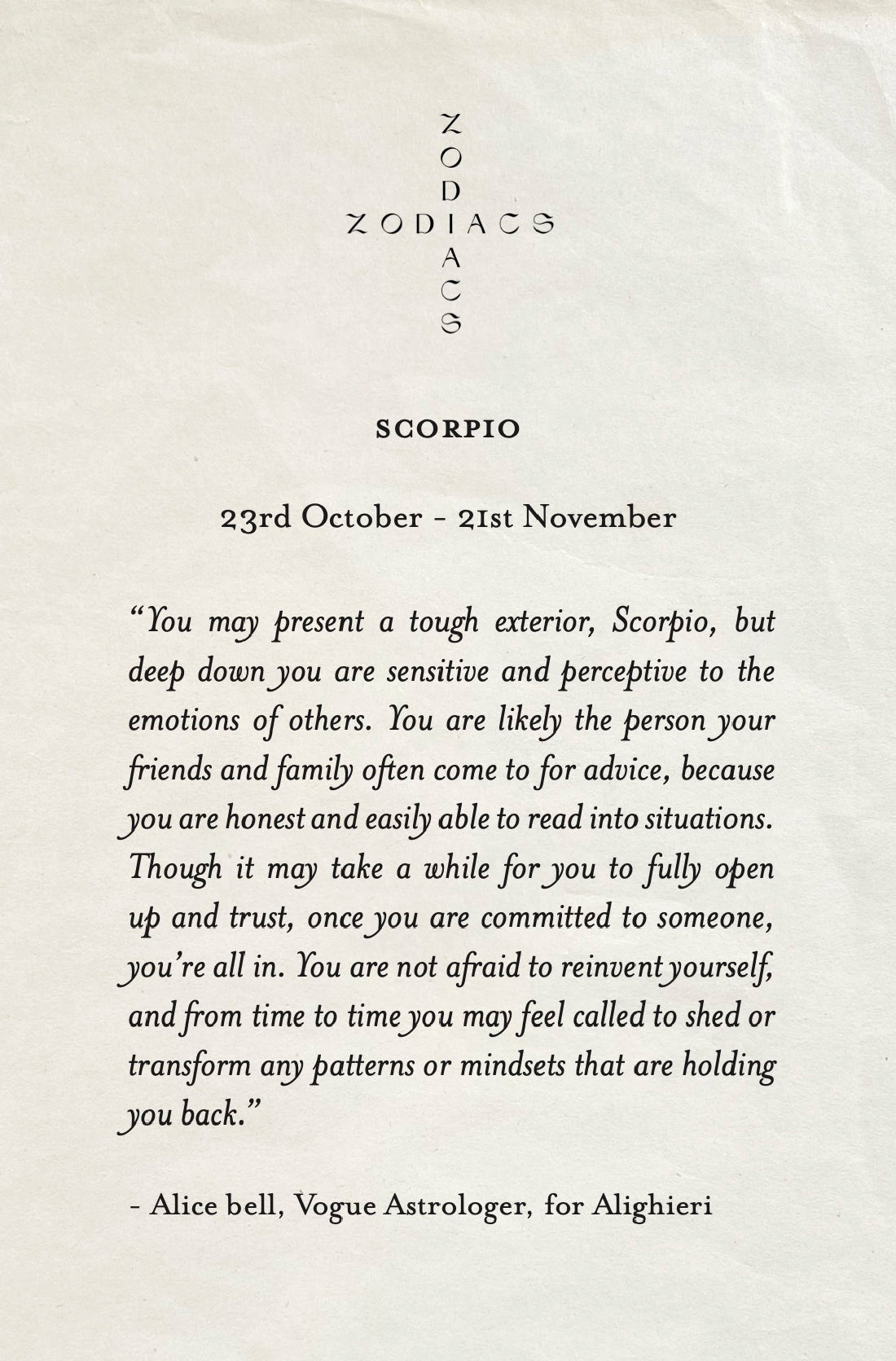 Enter the world of the Scorpio brought to you with otherworldly artist, Mat Maitland and Vogue Astrologer Alice Bell. Carry the power of your sign to stay connected to your stars.