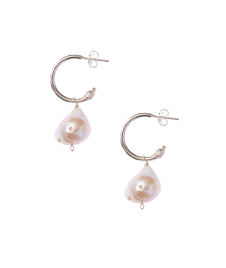 The Snow Lion and the Baroque Earrings are handcrafted from sterling silver and a freshwater baroque pearl in Hatton Garden, London.